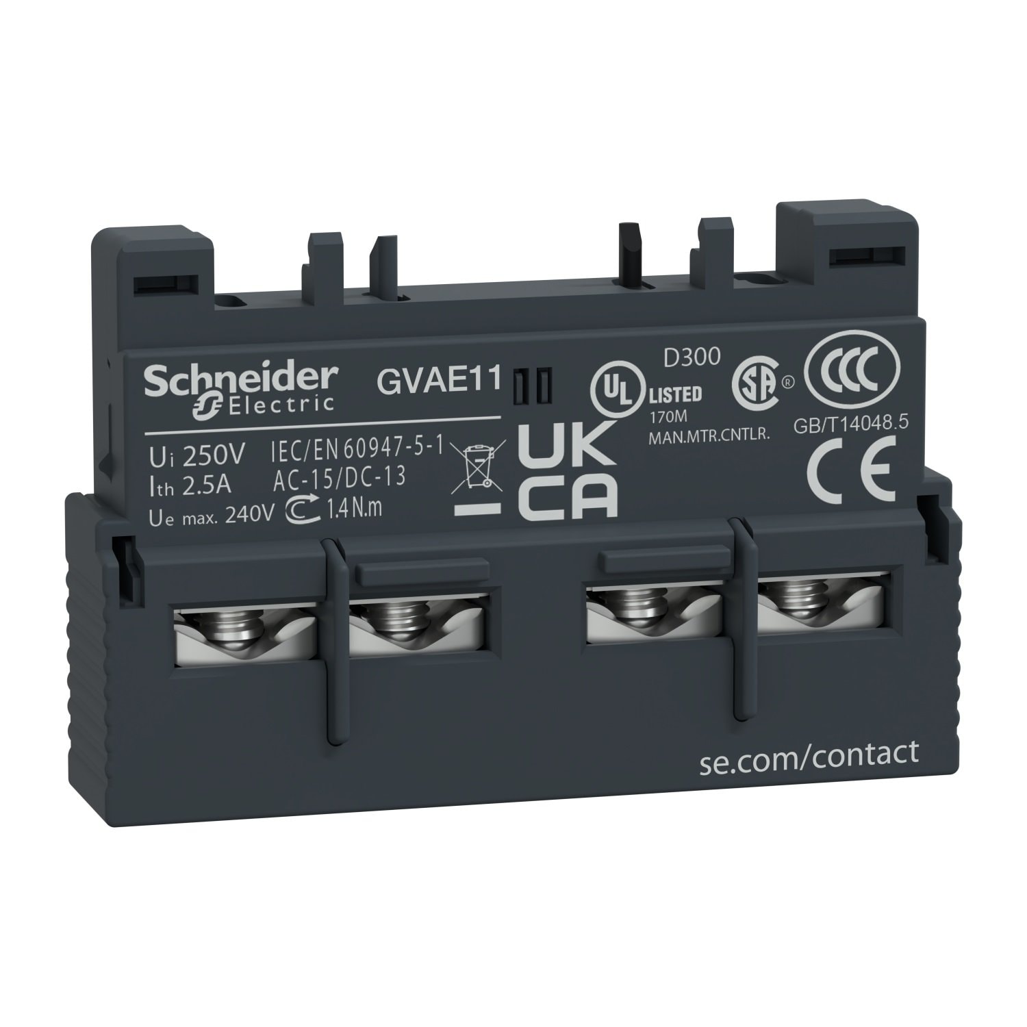 Bloque de contactos auxiliares TeSys GV para interruptores automáticos de motor GV2 y GV3. Contactos auxiliares instantáneos 1 NA + 1 NC Especificado para funcionar hasta a 2 A/240 V CA y 1 A/60 V CC. Para instalar en la parte frontal del interruptor automático, conexión mediante bornes de tornillo. Se vende en lotes de 10 unidades. Certificado por diversas normas (IEC, UL, CSA, CCC, EAC), cumple la norma Green Premium (RoHS/REACh).